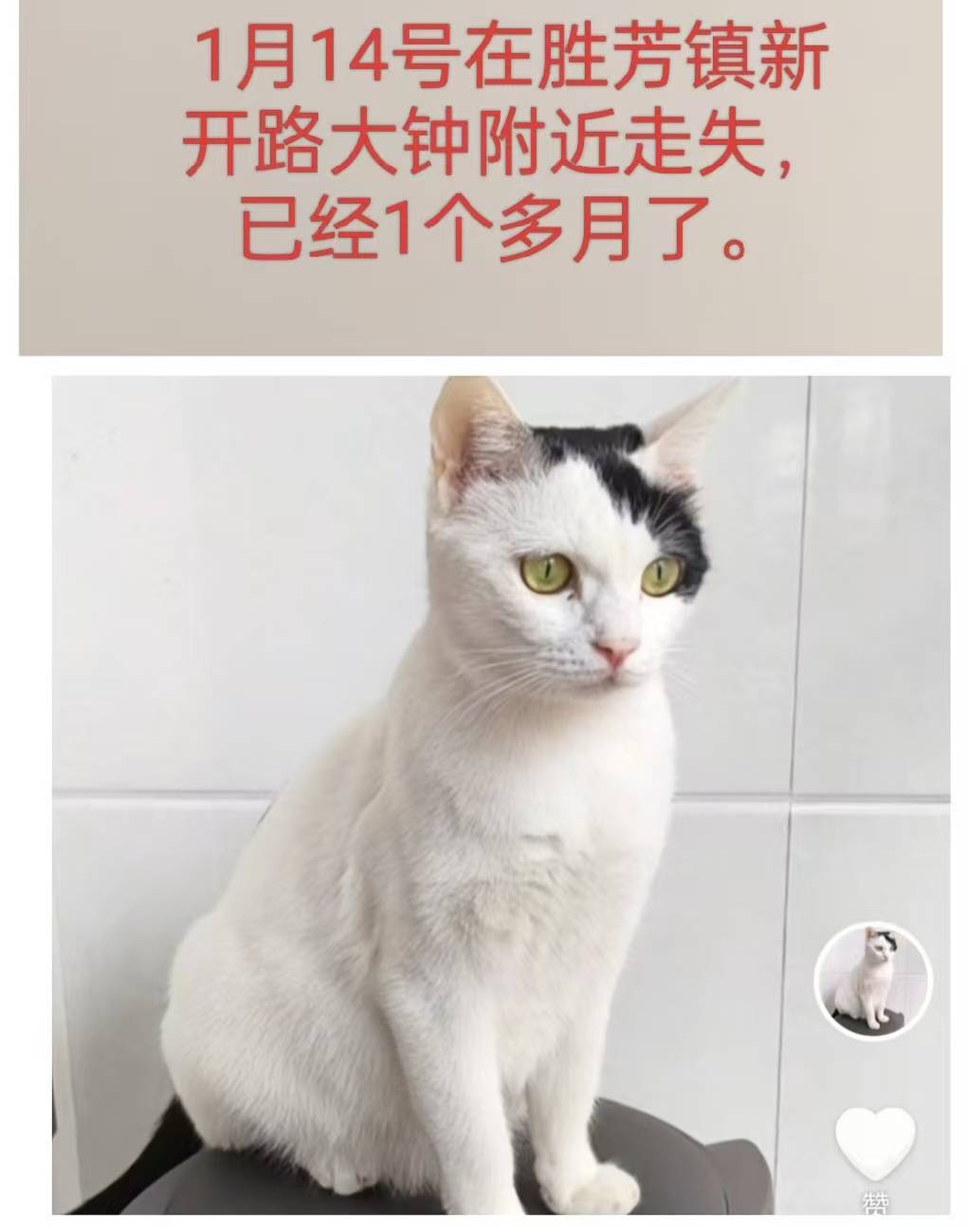 1ÔÂ14ºÅÔÚʤ·¼Ð¿ªÂ·´óÖÓ¸½½ü×ßʧһֻ³ÉÄêĸè°×É«£¬Í·²¿ÉíÉÏÓкÚÉ«£¬Î²°ÍºÚÉ«£¬ËÄËêδ¾øÓý£¬µ¨Ð¡ÅÂÈË£¬ÑøÁËËÄÄê¶àÁË£¬ÓиÐÇéÁË£¬ÓÐÌṩÓÐЧÏßË÷£¬ÕÒµ½»òÕßÊÕÁôÕߣ¬³ê½ð1000Ôª£¬¼ûµ½Ã¨¾Í¸ø£¬µç»°18632681167ͬ²½Î¢ÐÅ