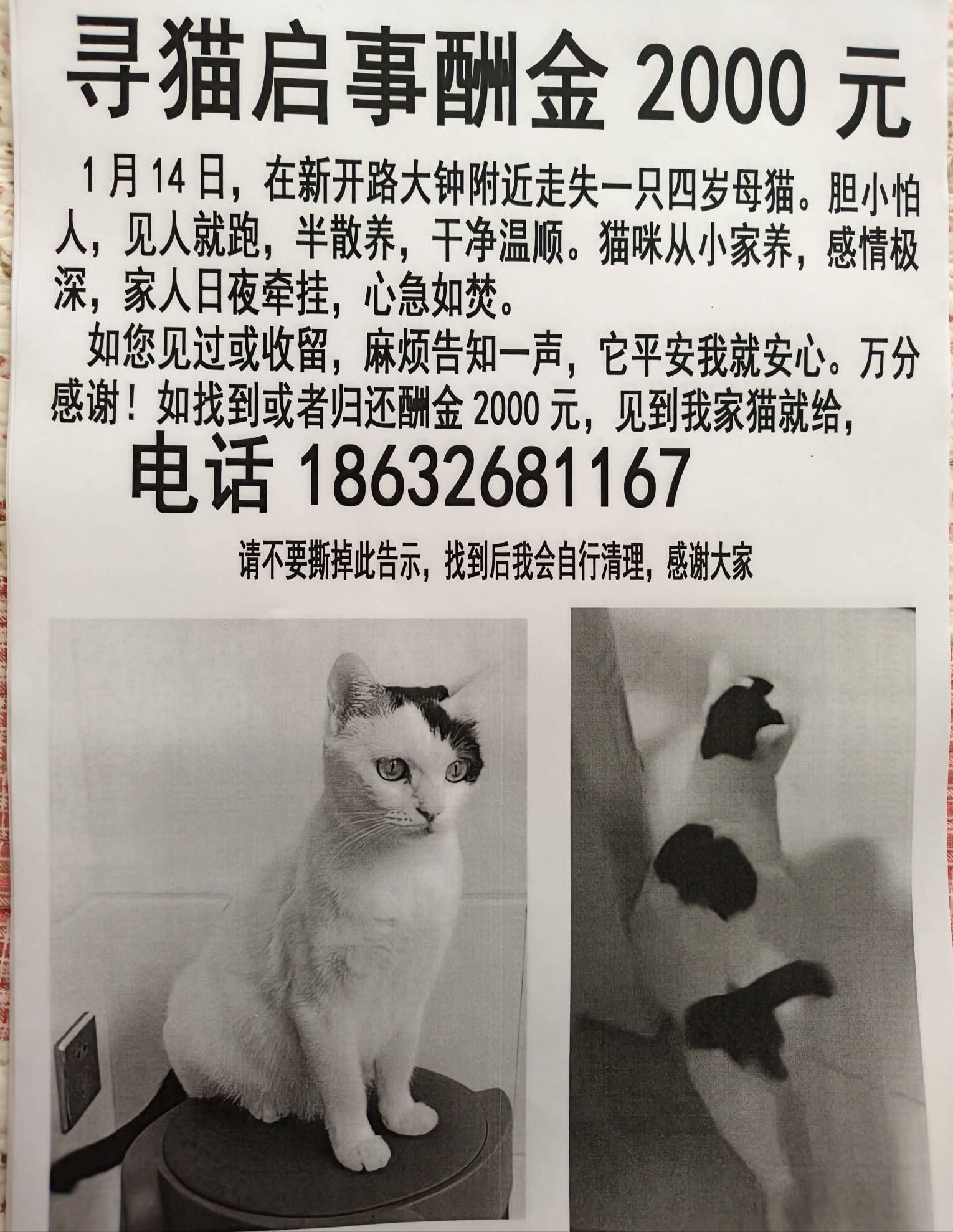 ±¾ÈËÓÚ1ÔÂ14ÈÕ£¬ÔÚʤ·¼ÕòпªÂ·´óÖÓ¸½½ü×ßʧһֻËÄËêĸè¡£
